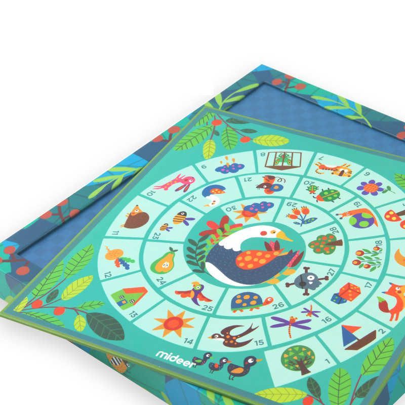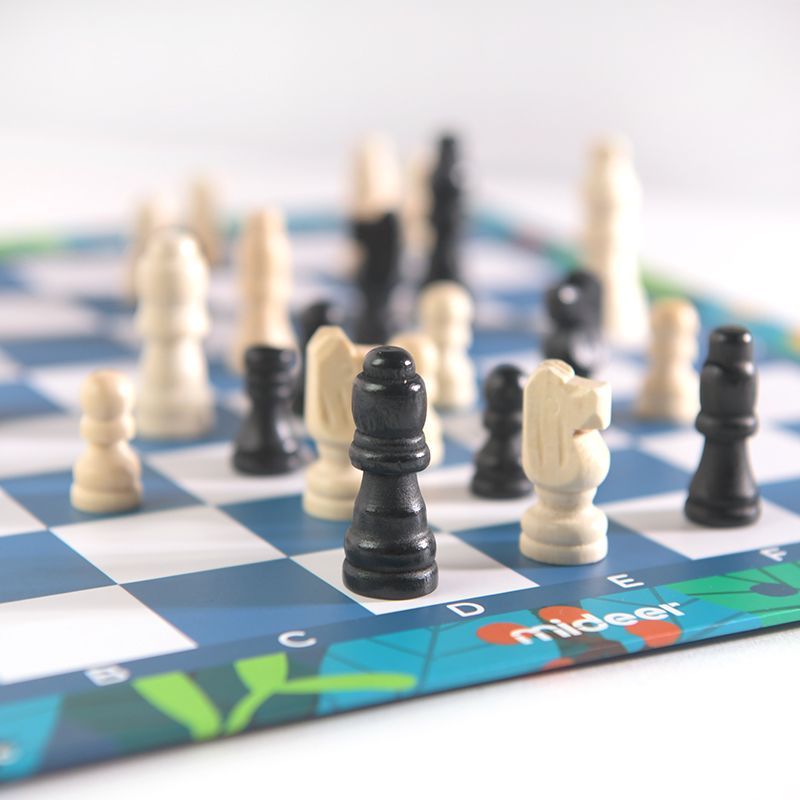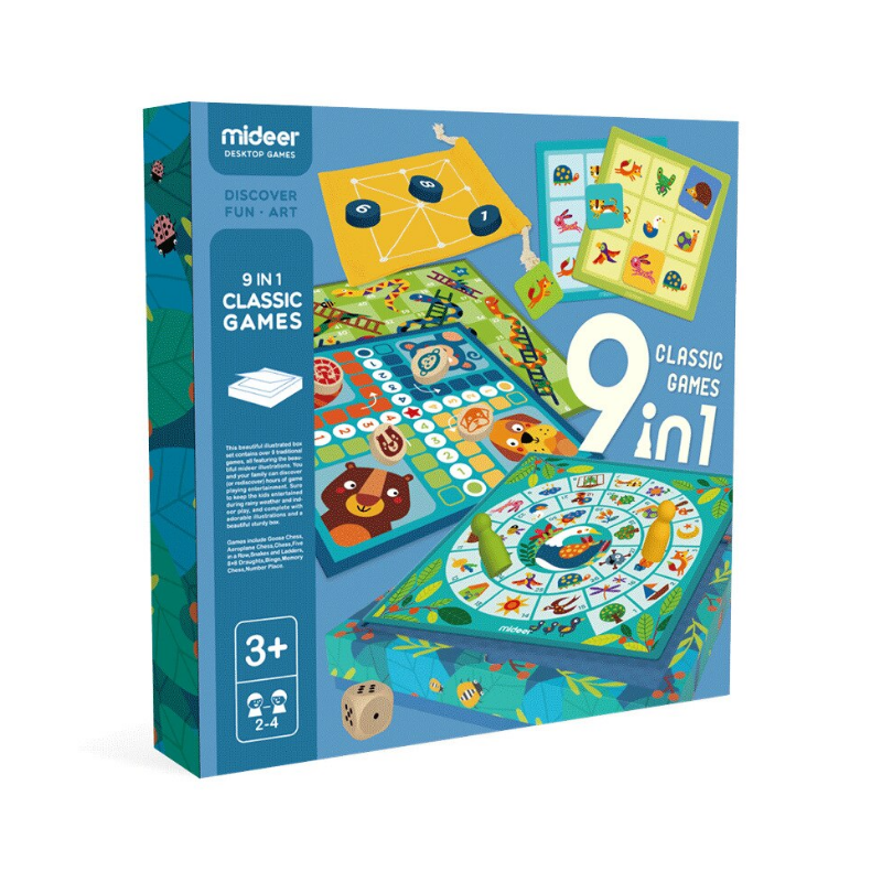 The games included in the set are: chess, airplane chess (very similar to Ludo), checkers, Ludo, snakes and ladders, goose chess, memory game, 8x8 halma, bingo.