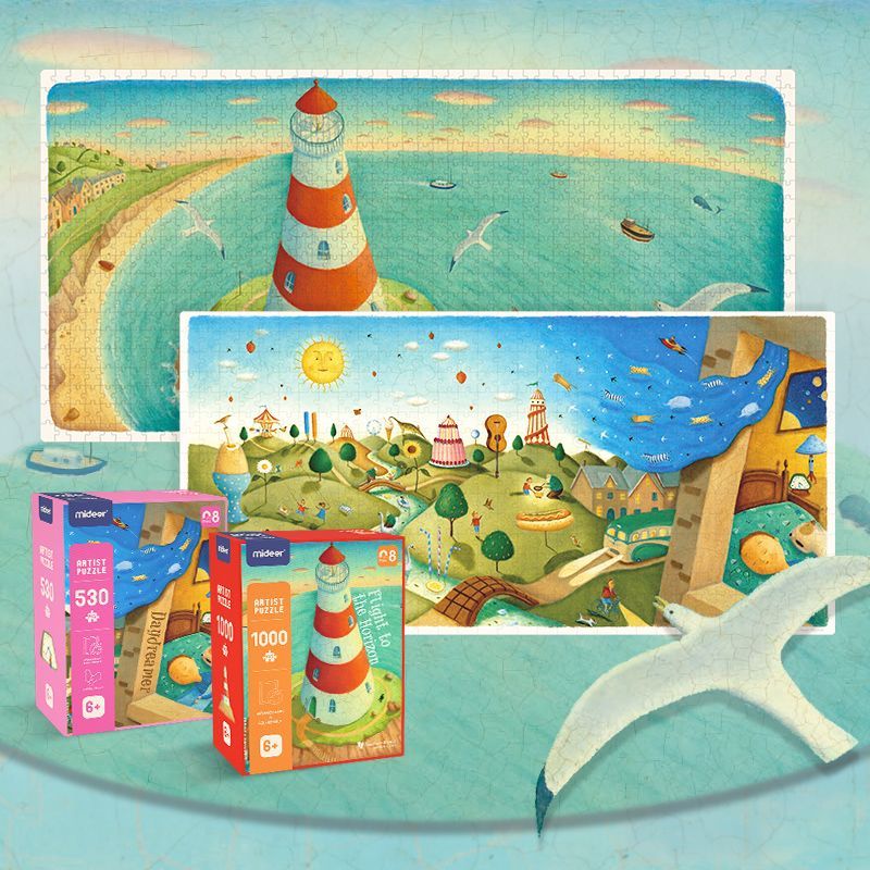 This art puzzle, once completed, displays the Dreamer design by artist Alison Jay. This renowned British artist paints images with a specific retro style, mysteriousness. The paintings depict children's fairy tales, which helps to develop children's imagination. Her work also incorporates motifs of animals, which she sees as part of our human life. Alison Jay is also famous for her children's book Welcome to the Zoo, which won the Best Book Award in 2009.
