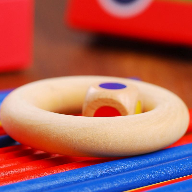 The package includes 27 coloured sticks, a coloured dice and a wooden ring.