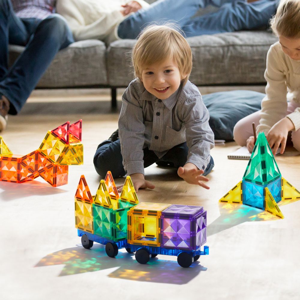 Díky barevným průhledným dílkům s pevně zabudovanými magnety si děti mohou postavit domy, hrady, mosty, věže a mnoho dalších tvarů podle své fantazie.