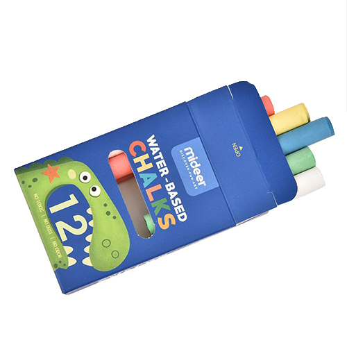 Krabička obsahuje celkem 12 ks křídy. V krabičce je celkem 5 barev (zelená, modrá, žlutá, červená) po 2ks, bílá 4ks.