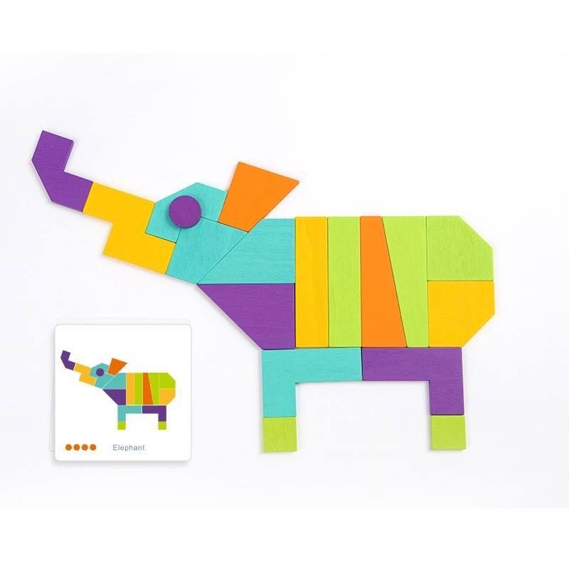 The puzzle contains a total of 20 pieces of templates with different pictures and 21 pieces of wooden geometric shapes.
