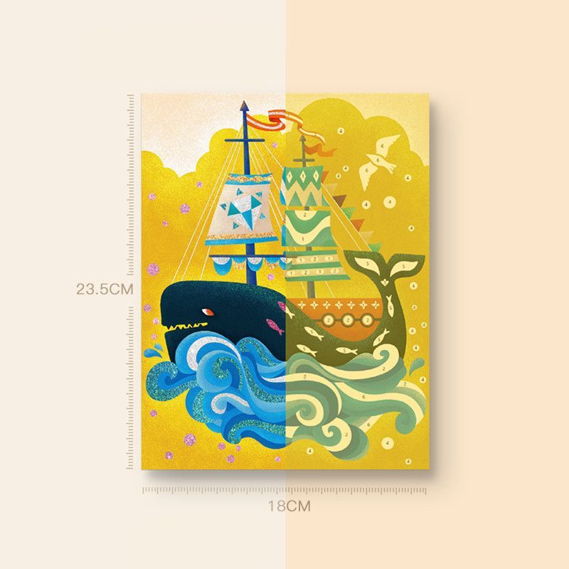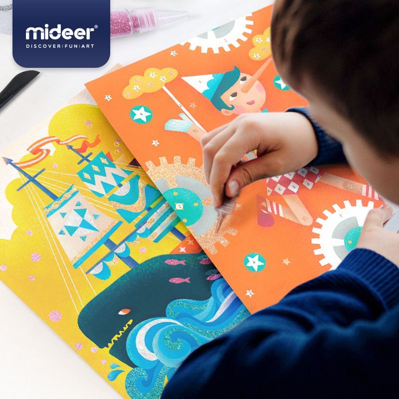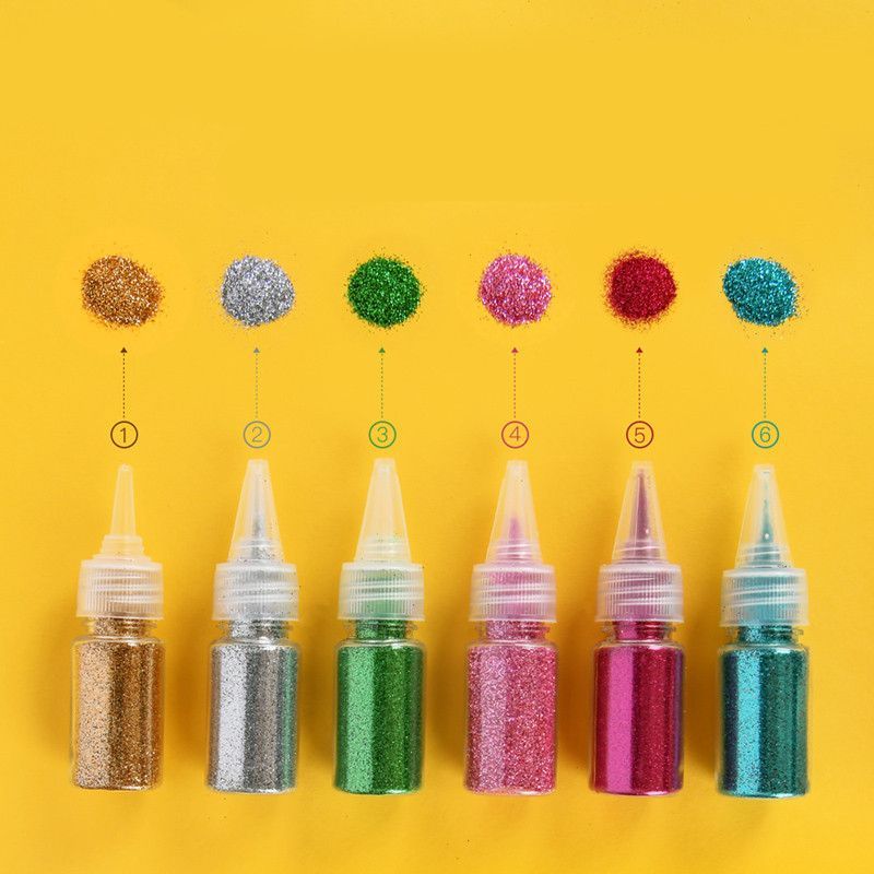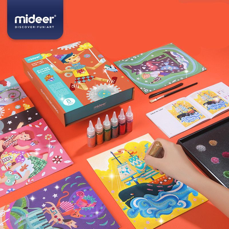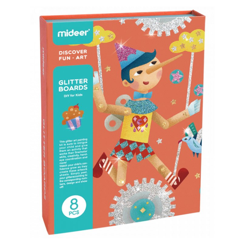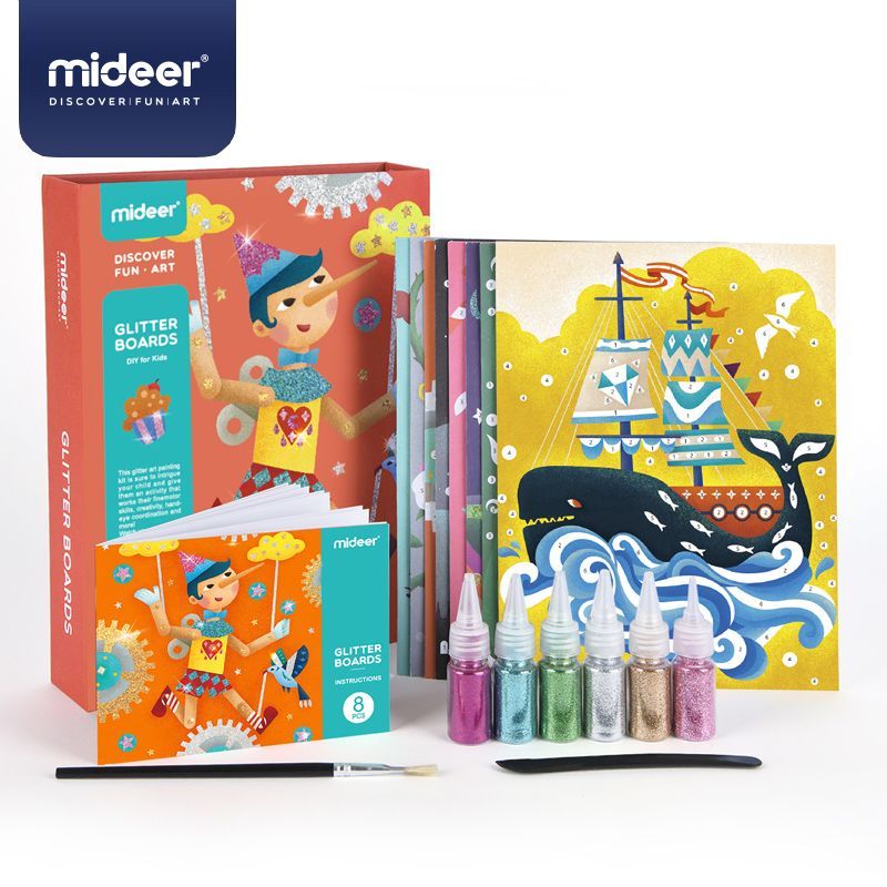 In the package you will find 8 pictures, a box, 6 types of glitter, a scraper spatula and a brush.