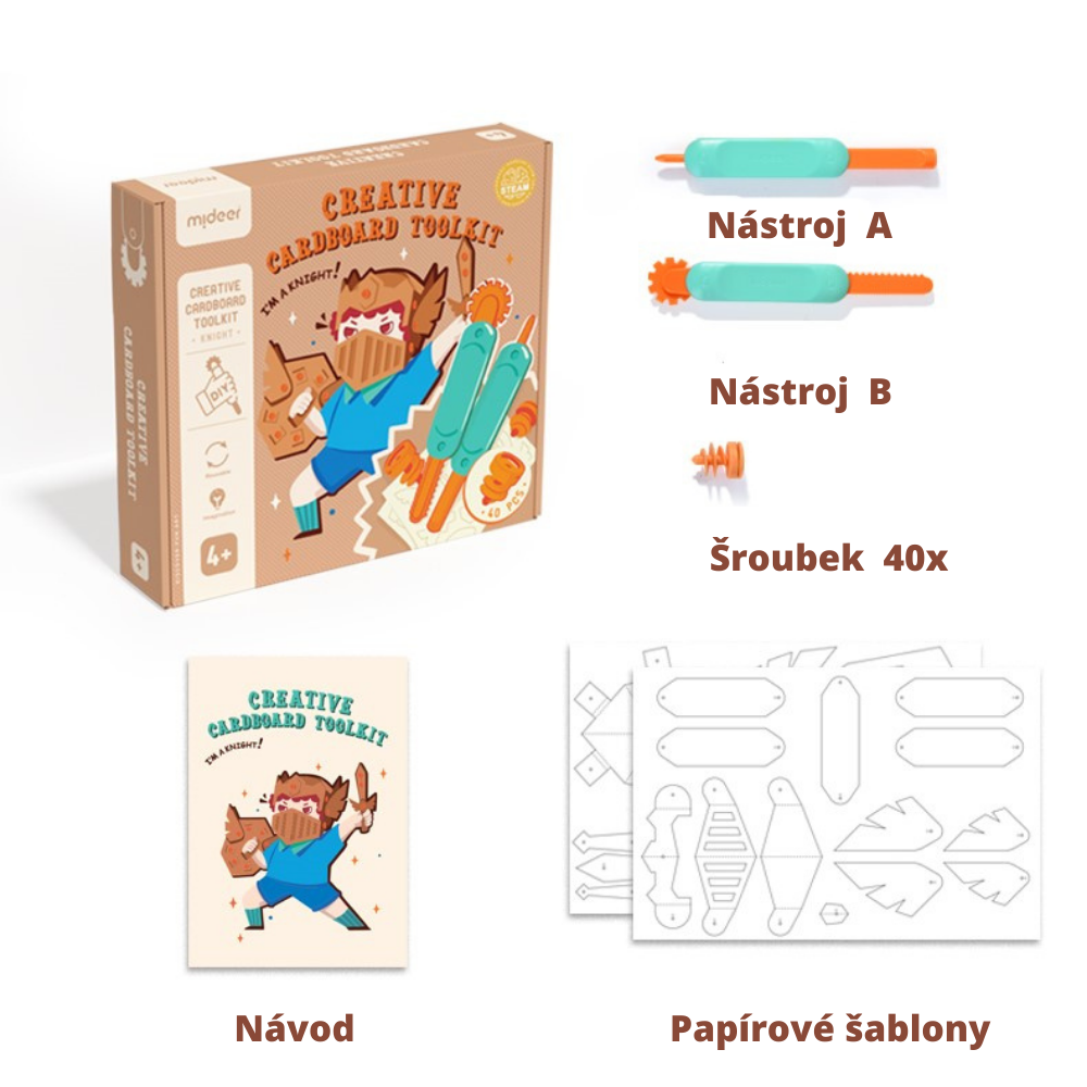 Součásti balení jsou šablony na meč, štít a helmu, dva nástroje na opracování kartonu a 40x šroub k propojení kartonových dílů.