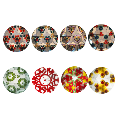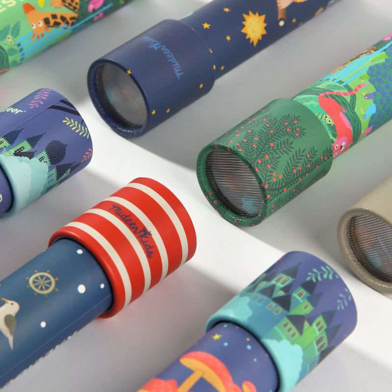 Široká škála rôznych vzorov kaleidoskopov vrátane radu kovových ďalekohľadov.