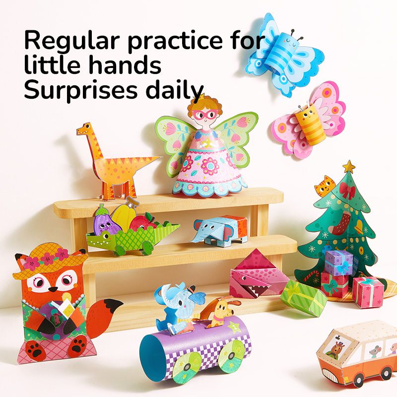 An interactive creative set from the LEVEL UP series that guides children aged 3 and up through the world of folding, cutting, gluing, and coloring. Each sheet is a small artistic task—together with their parents, they can transform it into a beautiful creation.