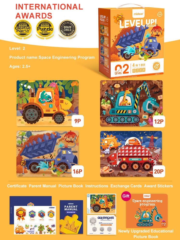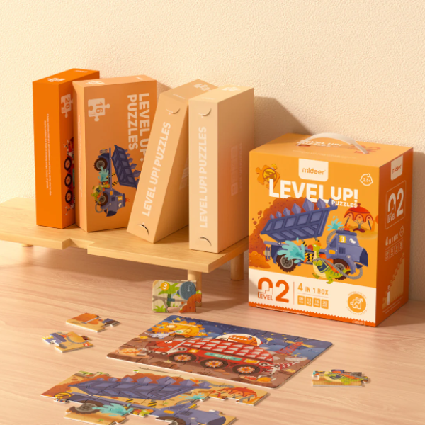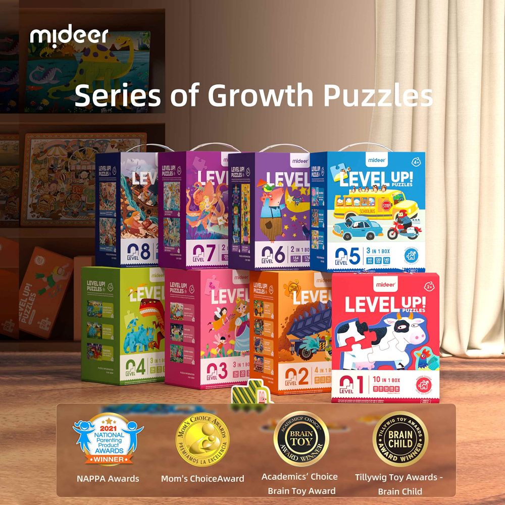 The advanced system of this puzzle is mainly manifested in three aspects. The number of pieces starts from 2 pieces and gradually increases up to 252 pieces. It also changes according to the complexity of the illustration from animal pictures to natural, urban and other scenes, and in the highest complexity to world geography, thus appropriately expanding the scope of children's cognition. Finally, the artistic rendering of the illustration has different levels.