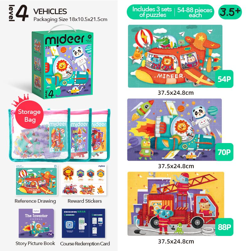 The puzzle contains a total of 3 puzzles with a transport theme. The puzzles contain 54, 70, and 88 pieces.