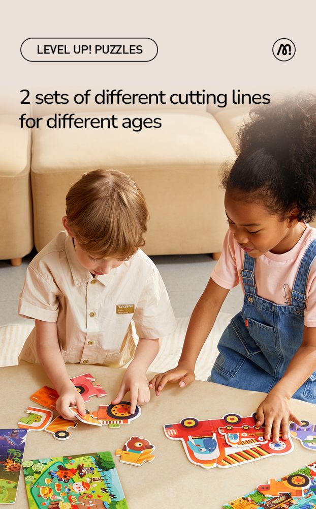 The advanced system of this puzzle is evident in three aspects. The number of pieces starts at 2 and gradually increases to 330. Furthermore, depending on the complexity of the illustration, the images change from animals to nature, cityscapes, and other scenes, and at the highest level of complexity, to world geography, thereby appropriately expanding the scope of children's learning. Finally, the artistic rendering of the illustrations also has different levels.