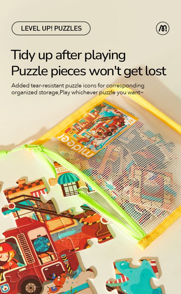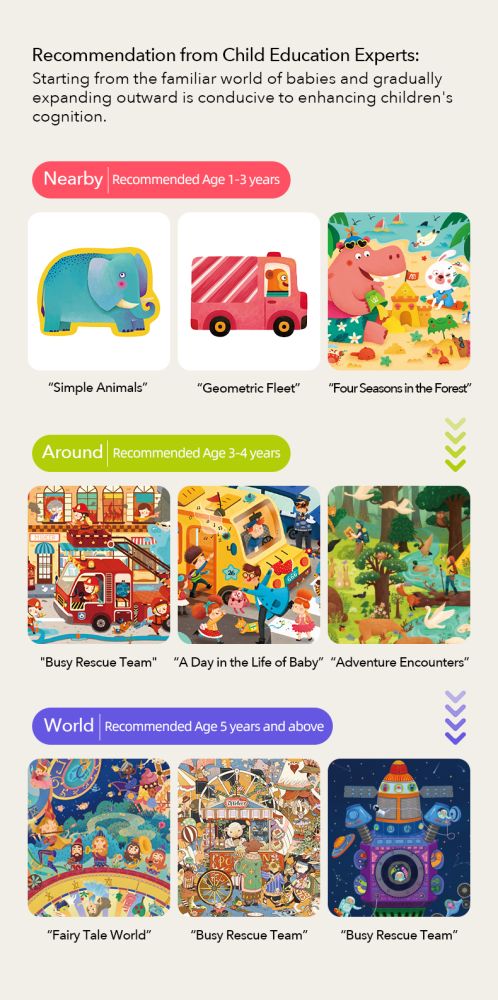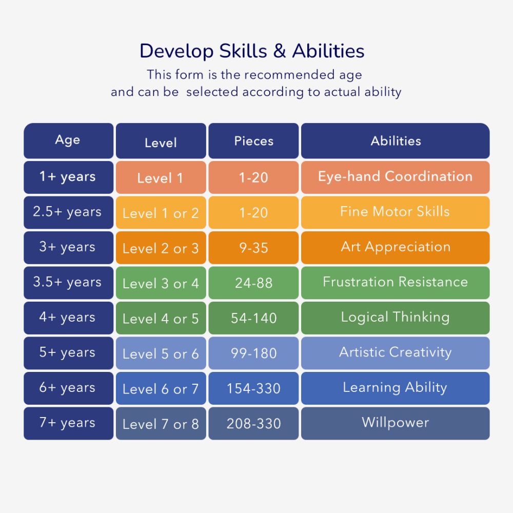 Tato sada puzzle obsahuje celkem 8 stupňů podle vývoje inteligence dětí ve věku 1-8 let, přičemž každý stupeň odpovídá dětem různého věku.