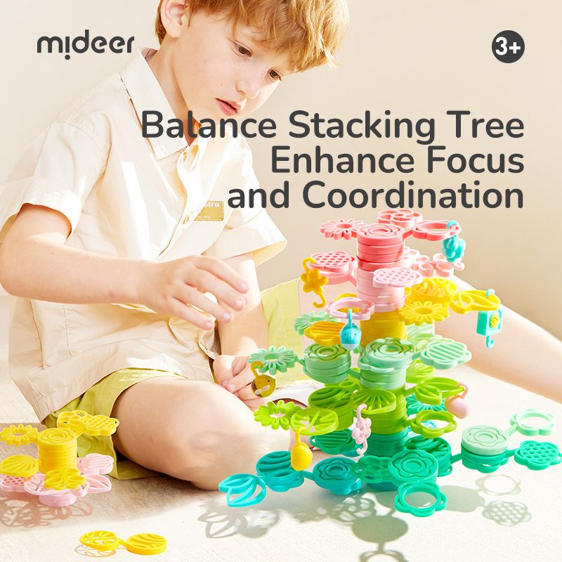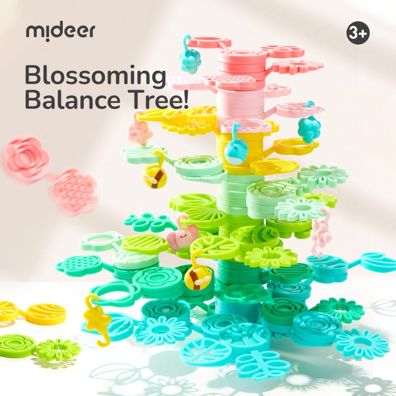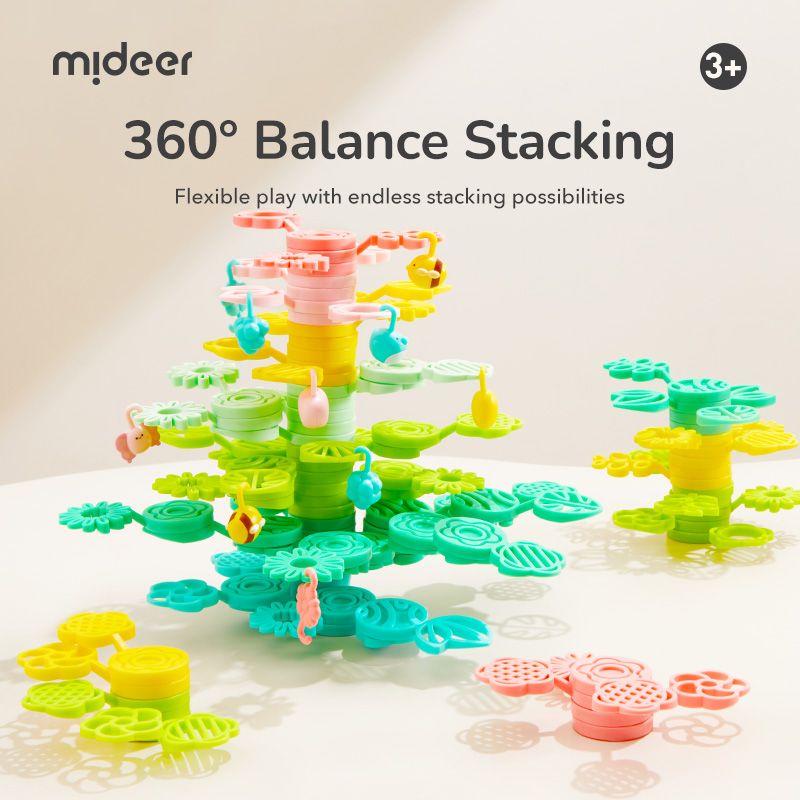Mideer Magiczny drzewo równowagi to kolorowy zestaw elementów w kształcie liści i gałązek, z których dzieci mogą zbudować swoje własne drzewo marzeń – wysokie, rozgałęzione lub całkowicie fantazyjne.