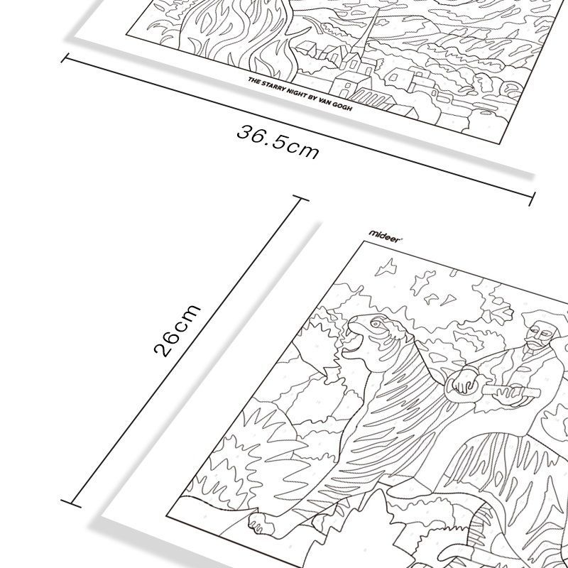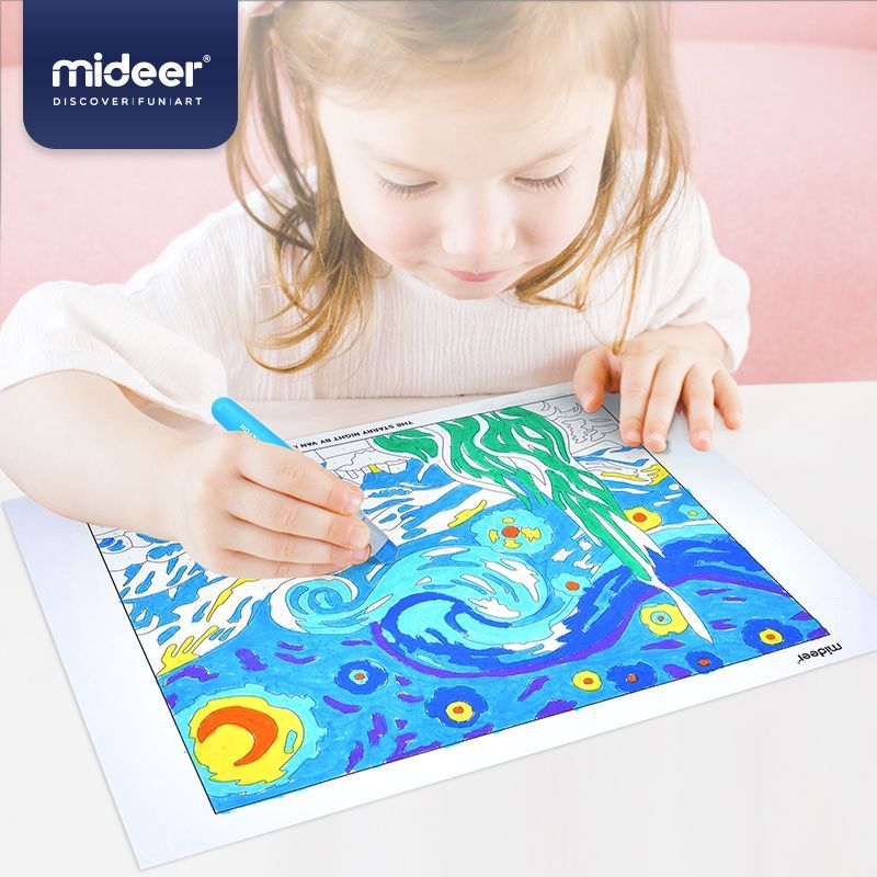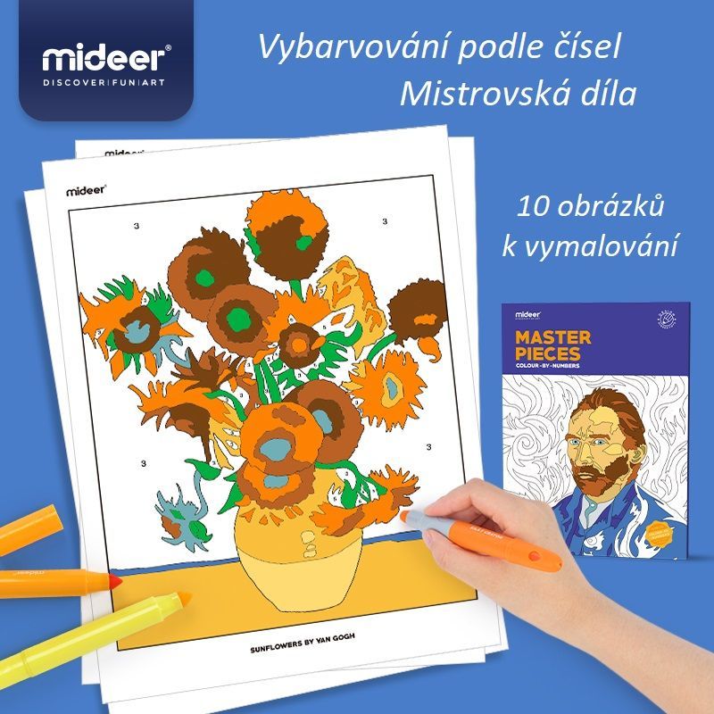 A színező készlet világhírű művészek jelentős alkotásait tartalmazza. Kiszínezheted Leonardo da Vinci Mona Lisáját vagy Van Gogh Napraforgóit.