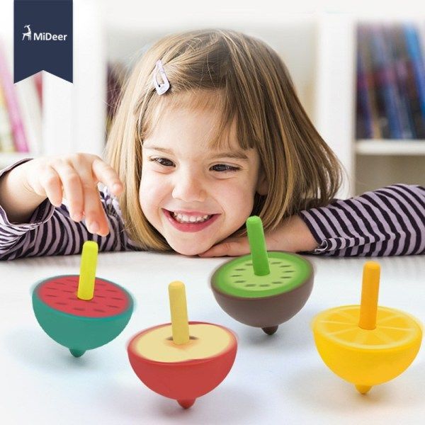 The body of the spinning top is wooden with a watermelon design.
