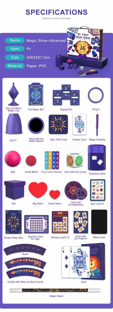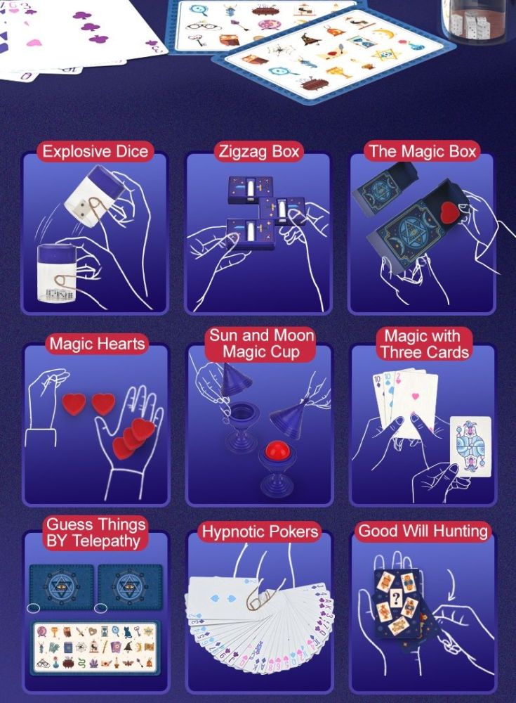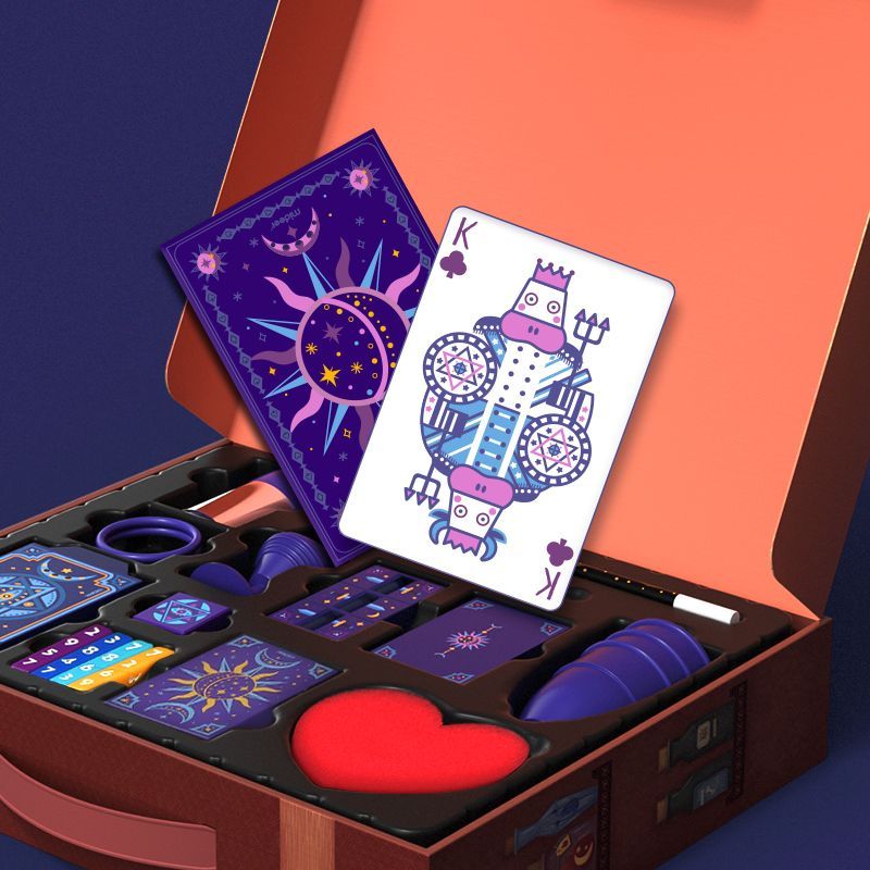 Set includes: 20 props (wand, dice, cards, cups), case.