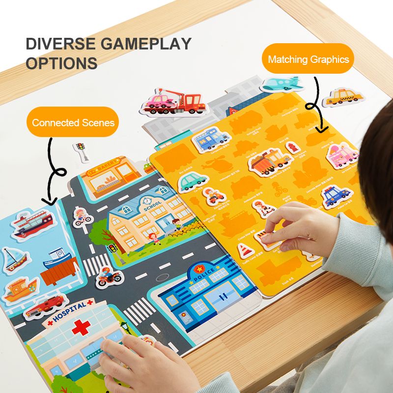 The book shows different places in the city. Take a sheet of gel stickers and start sticking stickers in the book according to your imagination. This way you can create your own stories and adventures.