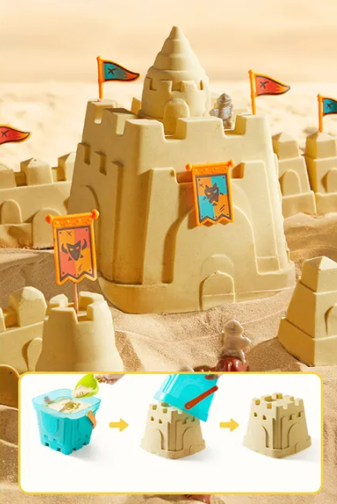 Sada obsahuje nejen klasické dětské nářadí lopatky a hrabičky, formičky pro stavbu hradů, ale i koníky, vojáky a vlaječky pro dokonalou stavbu hradů z písku.