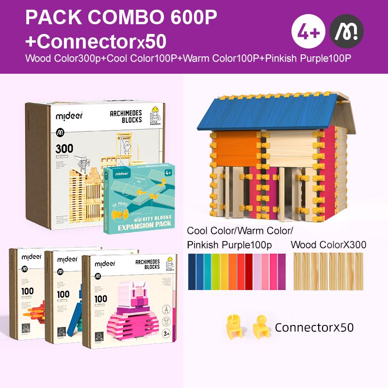 Das Set enthält 600 sorgfältig bearbeitete Holzklötze in einheitlicher Form, mit denen sich unbegrenzt viele Konstruktionen bauen lassen – von einfachen Häusern über Schiffe bis hin zu hohen Türmen oder ganzen Stadtlandschaften.Die Verbindungsstücke aus der Serie Mideer Blocks erweitern die Möglichkeiten des klassischen Baukastens um eine neue Dimension des Gestaltens. Dank ihnen verwandelt sich das Spiel in ein echtes Bauabenteuer – das Kind erhält Raum für Fantasie, Geduld und die Entwicklung des technischen Denkens. Mit ihnen können Kinder die Bausteine in verschiedenen Winkeln miteinander verbinden und 3D-Konstruktionen, Brücken, Türme und Häuser nach ihren eigenen Vorstellungen bauen.