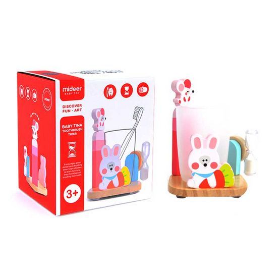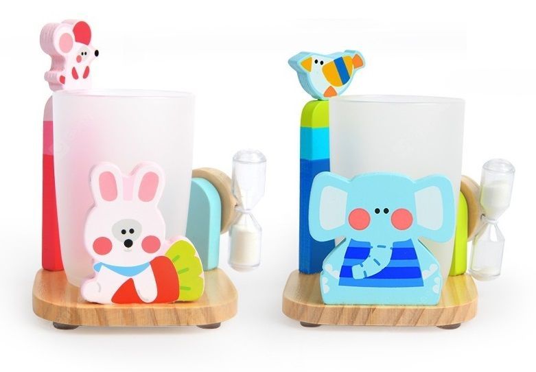 The stand also includes an hourglass that children can use to keep track of how long they have been brushing their teeth.
