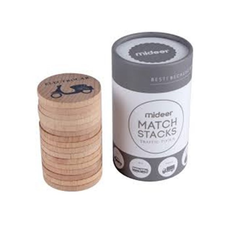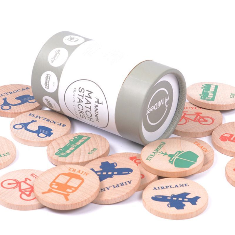 Každý tubus obsahuje 16kulatých dřevěných žetonů s obrázky různých dopravních prostředků.