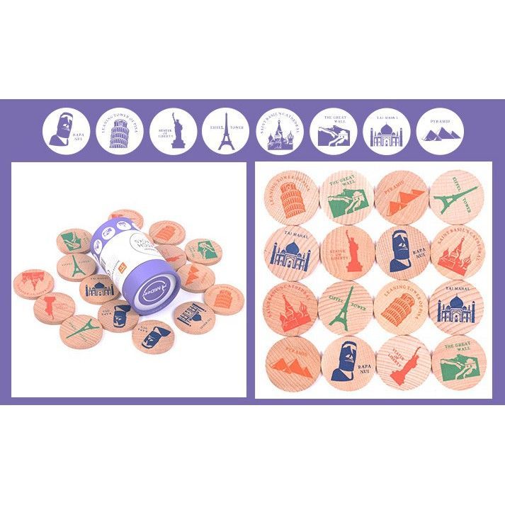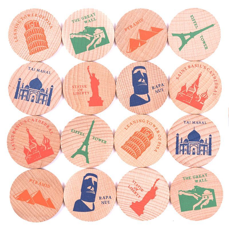 Rustikální dřevěné pexeso s barevným potiskem významných světových staveb.