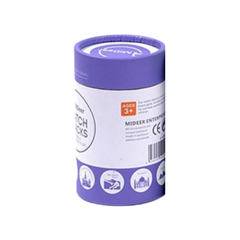 The tube-shaped pack contains 16 round wooden tokens with pictures of different types of architecture.