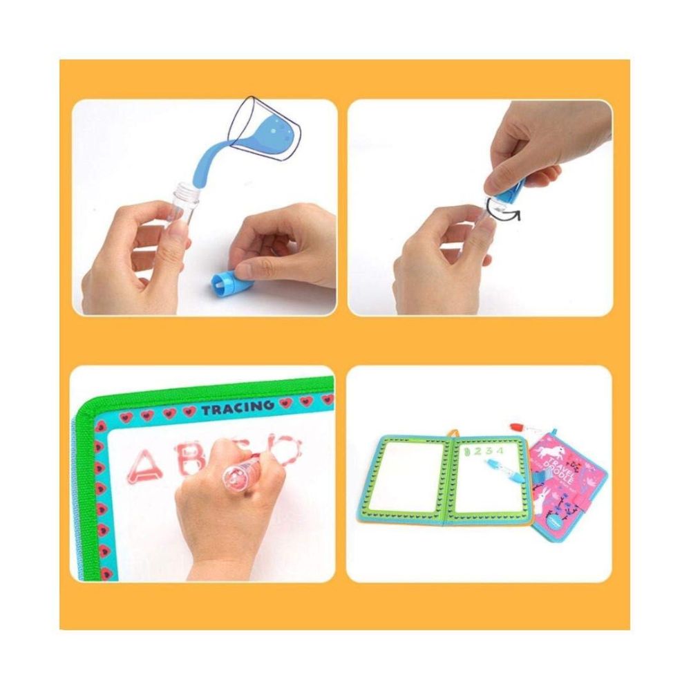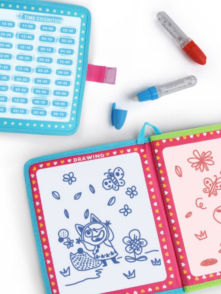 Zawiera wodny rysik, za pomocą którego dzieci mogą w magiczny sposób tworzyć swoje pierwsze obrazki i literki.