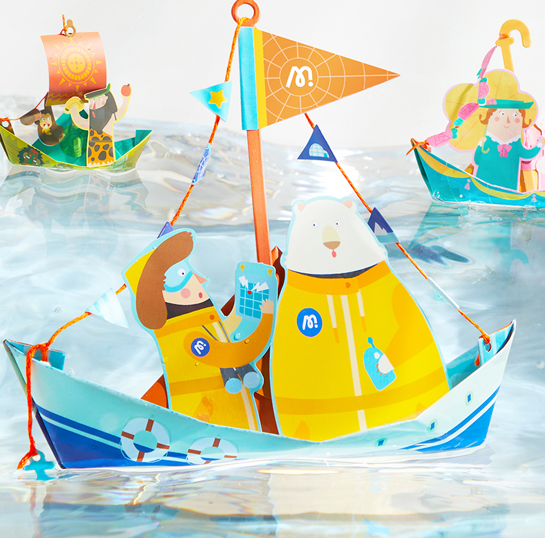 The paper craft is based on traditional origami, which originated in Japan. Thanks to the included elements (cardboard figures, stickers, strings, and colored paper), children can create three-dimensional models of ships, including crews.