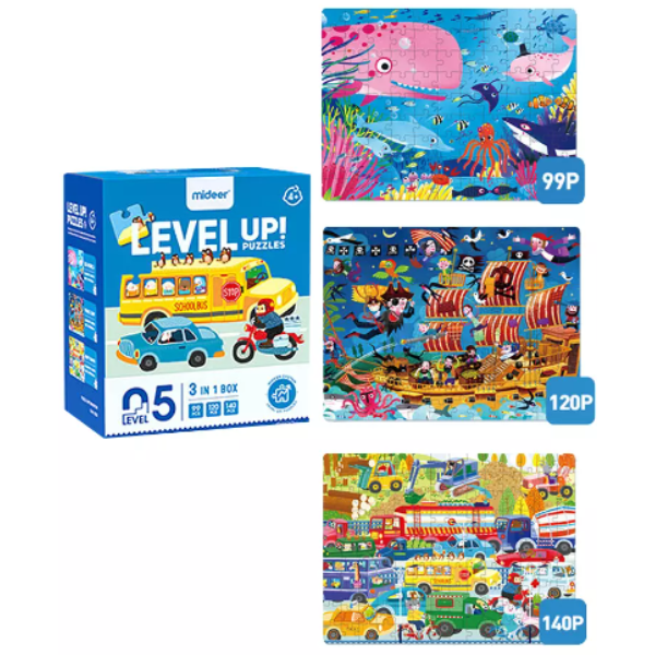 Puzzle obsahuje celkem 3 skládačky (99, 120 a 140 dílků) včetně praktických sáčků pro uložení dílků k jednotlivým skládačkám.