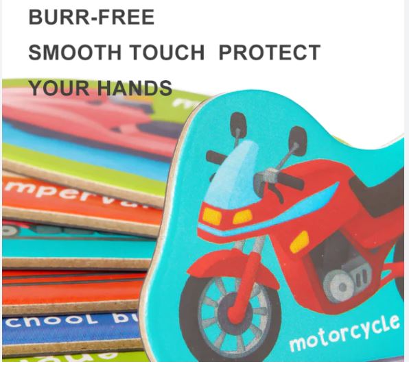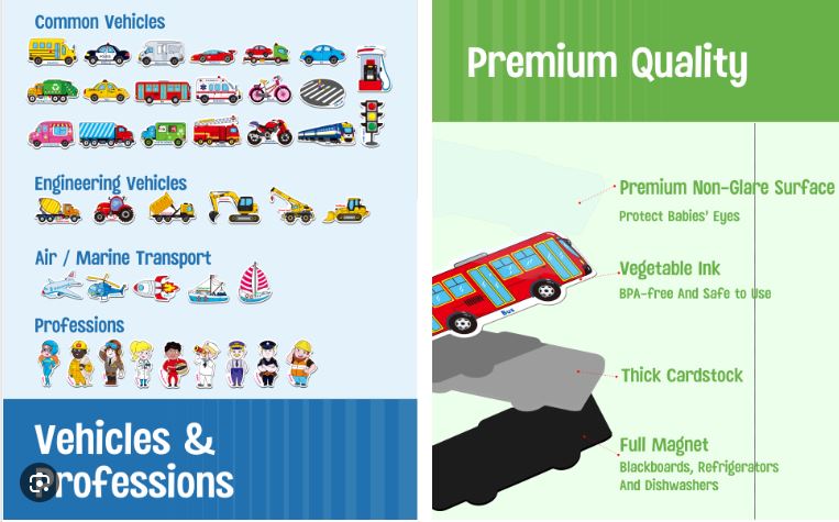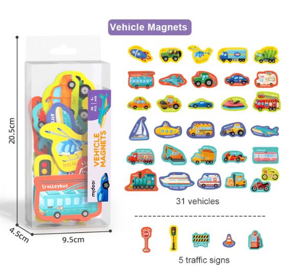 Each magnet is in the shape of a specific means of transport. On the magnet is also the English name of the picture.