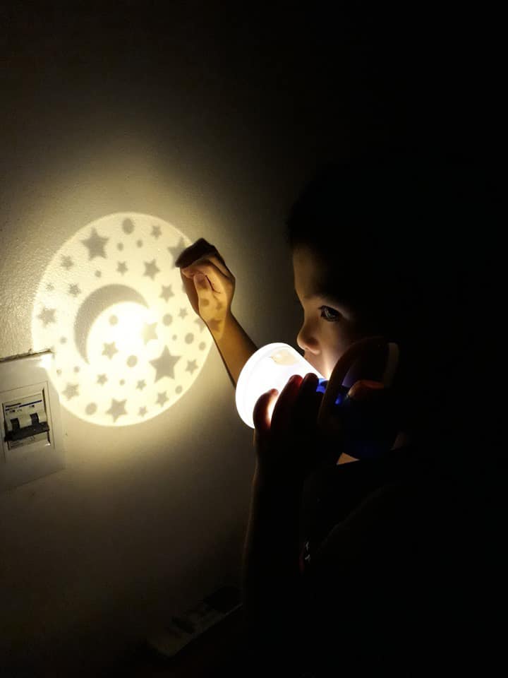 Multifunkční přístroj 4 v 1. Promítačka pohádek, přenosná svítilna, noční světlo a projektor noční oblohy. Sada obsahuje celkem 12 pohádek -Tři prasátka,  Červená karkulka, Kočka a liška bajka,  Ošklivé káčátko, Malenka, Pinocchio, Šťastný princ,  Popelka,  Pasáček, který rád žertoval, Perníček, Velká řepa, Cesta do vesmíru.Součástí balení je brožurka s českými/slovenskými texty pohádek a obrázky pro vypravěče.  Promítaná pohádka může mít rozměr až 50cm x 150cm, záleží na vzdálenosti. Zoom slouží k zaostření obrazu na zdi. Časovač automaticky přístroj vypne po 15.minutách Návod na použití: V horní části svítilny se vkládají kotoučky s pohádkami, kolečko se posunuje jemným otočením prstem. Červené tlačítko má 3 funkce: 1. zmáčknutí - zapne pohádkový projektor, 2 zmáčknutí - zapne světlo, 3 zmáčknutí - vypne světlo. Vhodné pro děti od 3 let.  Rozměry: 20,5cm x 15,5cm x 8cm