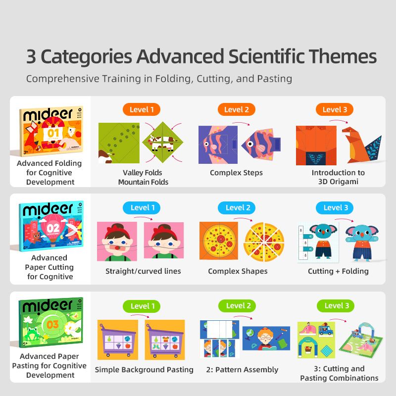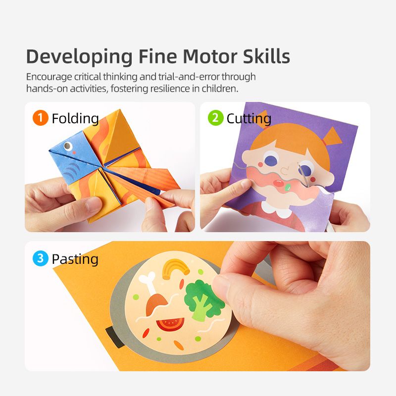 • Díky manipulaci se stříháním, skládáním a lepením to pomůže dítěti rozvíjet vynalézavost, umělecké vnímání, koordinační schopnosti a zvýšit schopnost se soustředit