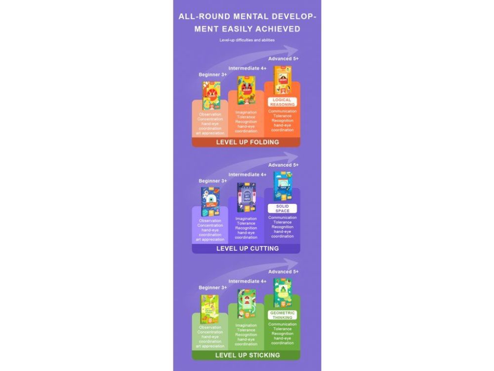 Kreatívna sada Mideer LEVEL UP obsahuje 3 úrovne skladačiek od jednoduchých po pokročilé.