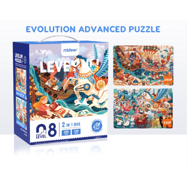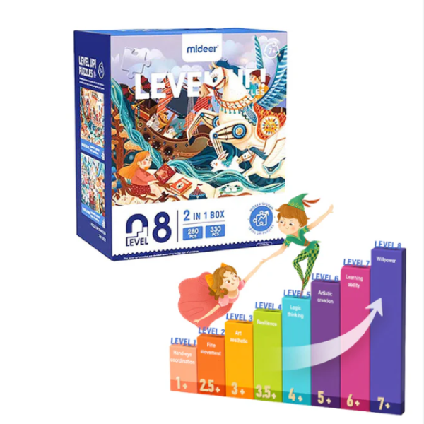 A LEVEL UP! kirakós fejlett rendszere elsősorban három vonatkozásban nyilvánul meg: A darabszám 2 darabtól indul, és fokozatosan növekszik egészen 330 darabig. Az illusztrációk nehézsége az állatos képektől a természet, a városi és egyéb jeleneteken át egészen a világ földrajzáig halad, ezzel bővítve a gyermekek tudását. Végül, az illusztráció művészi megjelenítésének is különböző szintjei vannak.
