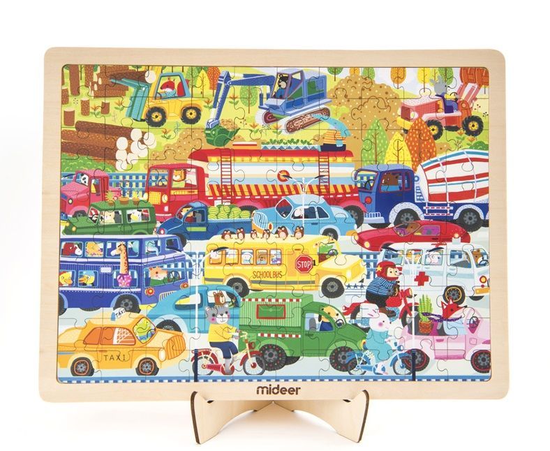 Tauchen Sie in bewegten Betrieb auf Hauptstraße mit Hilfe des Holzpuzzles mit Tematik des Transports.