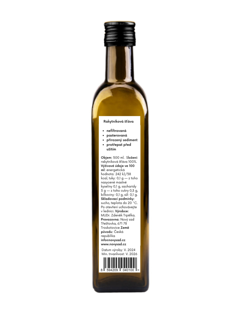 100% rakytníková šťáva vypěstovaná na jižní Moravě.