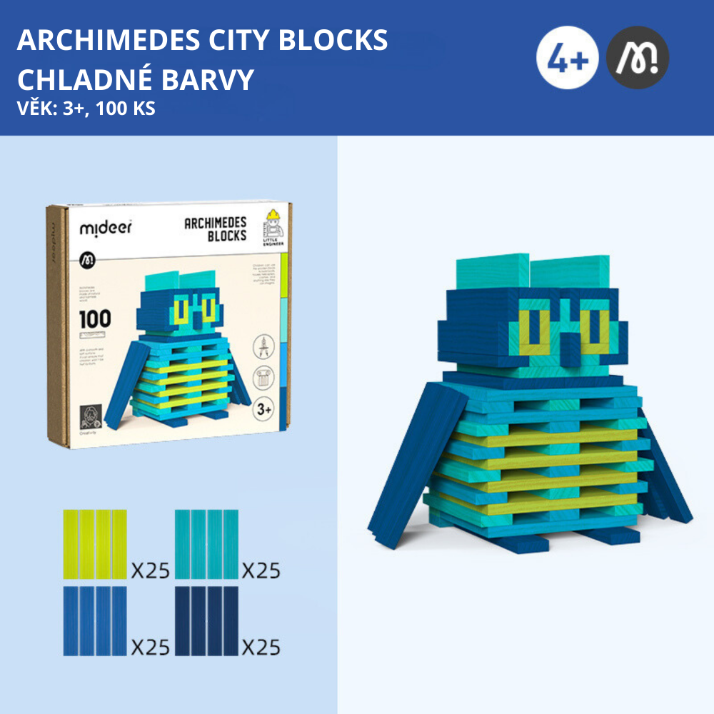 Archimedes Blocks je sada stavebních her s kostkami z přírodního dřeva. Řady Archimedes City blocks a  City Blocks umožňují stavět stavby od těch nejzákladnějších jednobarevných až po 3D modely v několika barvách.