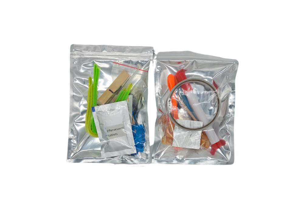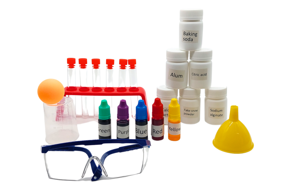 • Chemikálie v malých baleniach (napr. jedlá sóda, kyselina citrónová, alginát sodný, kamence, umelý sneh) určené na jednoduché a bezpečné experimenty.
