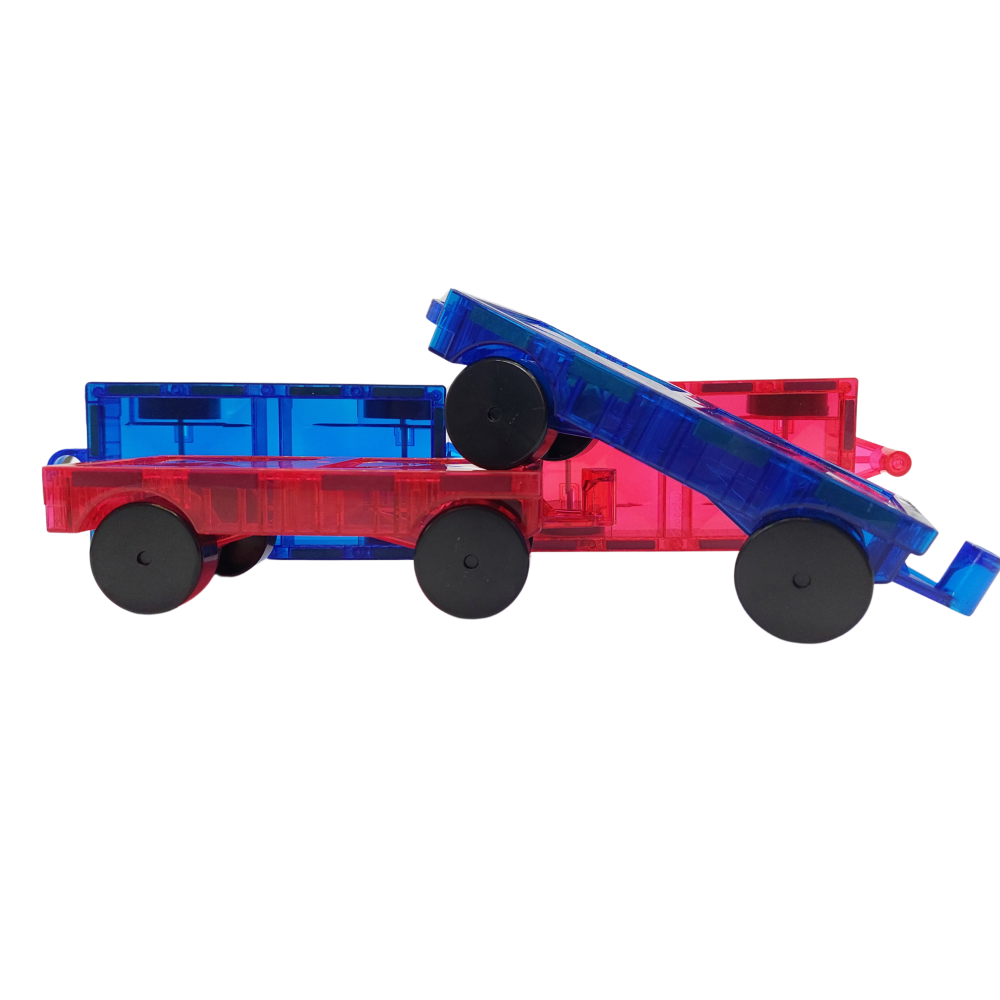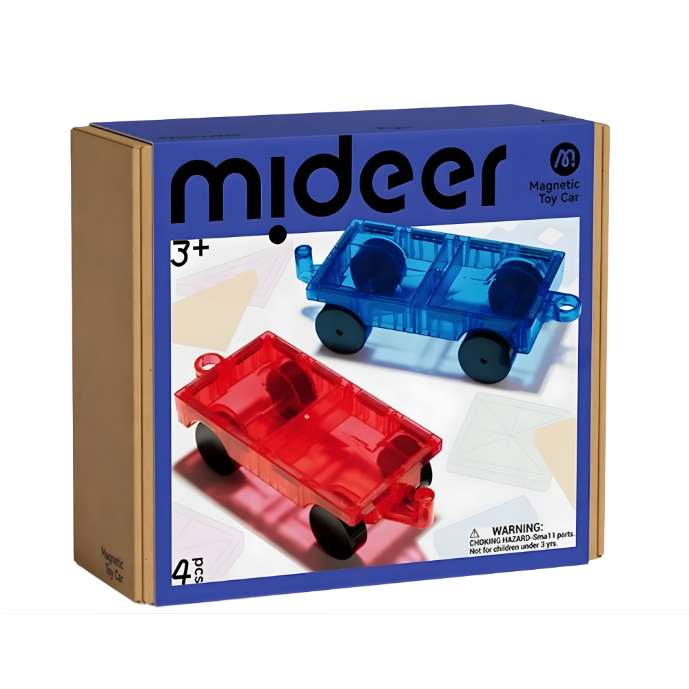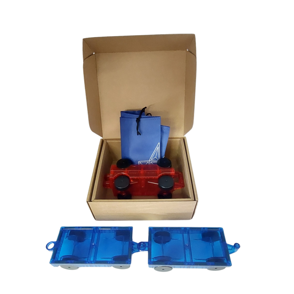 Sada obsahuje dvě robustní a průhledná autíčka v modré a červené barvě, která jsou navržena tak, aby snadno spojovala různé magnetické díly a umožnila stavět pohyblivé konstrukce – od jednoduchých vozidel až po složité dopravní systémy.