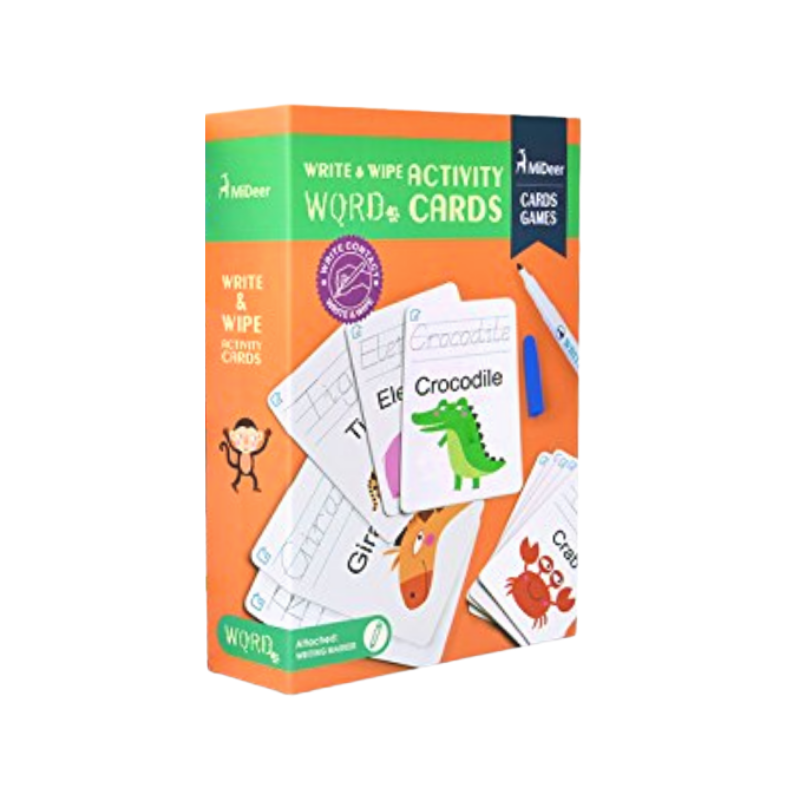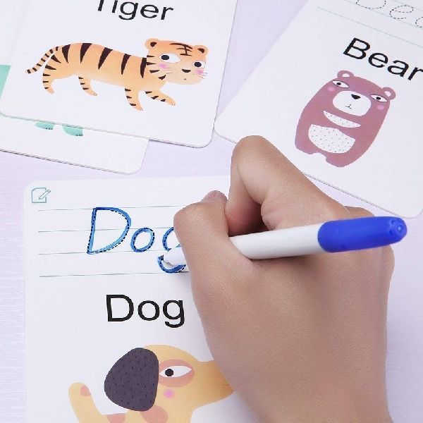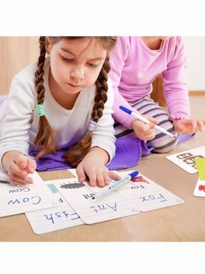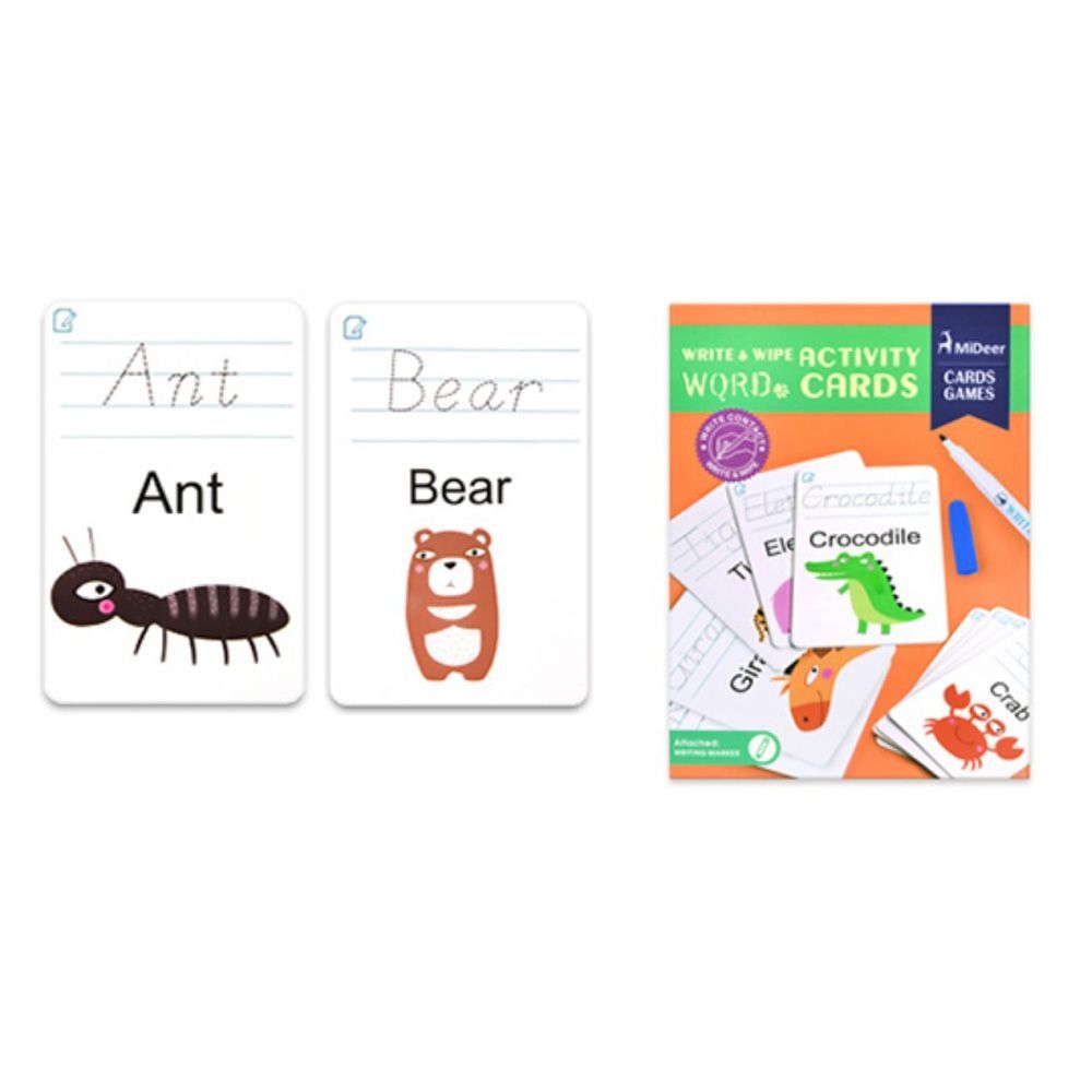 Každá karta je opatřena opakovaně použitelným povrchem, takže děti si mohou snadno procvičit své znalosti, kartu otřít a začít znovu.